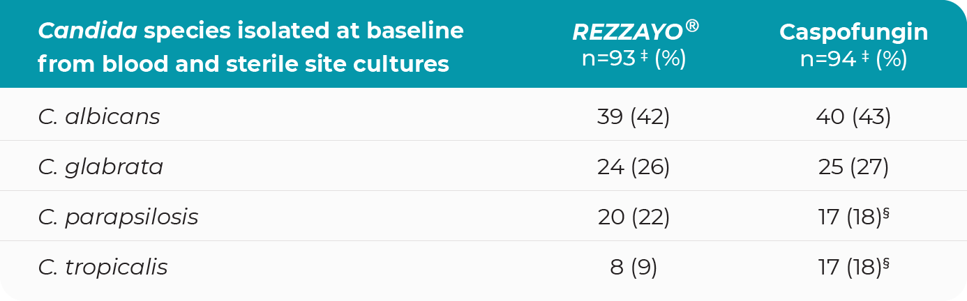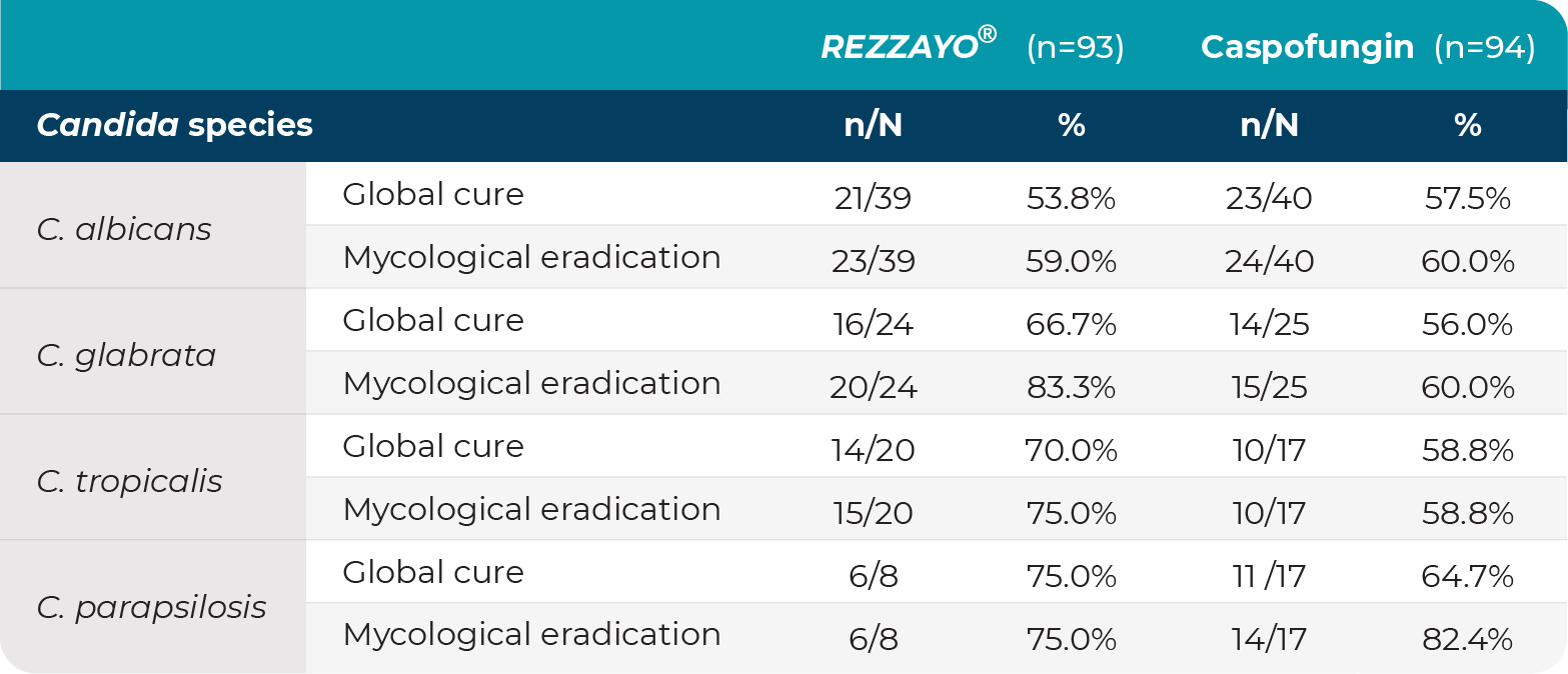 References:1. REZZAYO®. Prescribing information. Melinta Therapeutics, LLC; 2025. 2. Thompson GR, Soriano A, Skoutelis A, et al. Rezafungin versus caspofungin in a phase 2, randomized, double-blind study for the treatment of candidemia and invasive candidiasis: the STRIVE trial. Clin Infect Dis. 2021;73(11):e3647-e3655. doi:10.1093/cid/ciaa1380 3. Thompson GR 3rd, Soriano A, Cornely OA, et al. Rezafungin versus caspofungin for treatment of candidaemia and invasive candidiasis (ReSTORE): a multicentre, double-blind, double-dummy, randomised phase 3 trial. Lancet. 2023;401(10370):49-59. doi:10.1016/S0140-6736(22)02324-8 4. Toda M, Williams SR, Berkow EL, et al. Population-based active surveillance for culture-confirmed candidemia – four sites, United States, 2012-2016. MMWR Surveill Summ. 2019;68(8):1-15. doi:10.15585/mmwr.ss6808a1 5. Thompson GR, Soriano A, Cornely OA, et al. Outcomes by baseline pathogen and susceptibility in the ReSTORE phase 3 trial of rezafungin once weekly compared with caspofungin once daily in patients with candidemia and/or invasive candidiasis. Poster presented at: IDWeek 2022; October 19-23, 2022; Washington D.C. Accessed February 13, 2023. https://academic.oup.com/ofid/article/9/Supplement_2/ofac492.309/6902562 6. Centers for Disease Control and Prevention (CDC). Invasive candidiasis statistics. Reviewed January 13, 2023. Accessed January 23, 2023. https://www.cdc.gov/fungal/diseases/candidiasis/invasive/statistics.html 7. Pfaller MA, Carvalhaes C, Messer SA, Rhomberg PR, Castanheira M. Activity of a long-acting echinocandin, rezafungin, and comparator antifungal agents tested against contemporary invasive fungal isolates (SENTRY Program, 2016 to 2018). Antimicrob Agents Chemother. 2020;64(4):e00099-20. doi:10.1128/AAC.00099-206. 8. Berkow EL, Lockhart SR. Activity of CD101, a long-acting echinocandin, against clinical isolates of Candida auris. Diagn Microbiol Infect Dis. 2018;90(3):196-197. doi:10.1016/j.diagmicrobio.2017.10.021 9. Subcommittee (SC) on antifungal susceptibility tests. CLSI. June 9, 2021. Accessed March 27, 2023. https://clsi.org/media/gvuivvig/2021_summer_afsc_agenda_summary_minutes.pdf