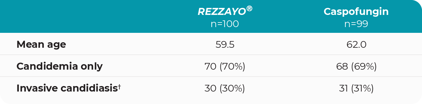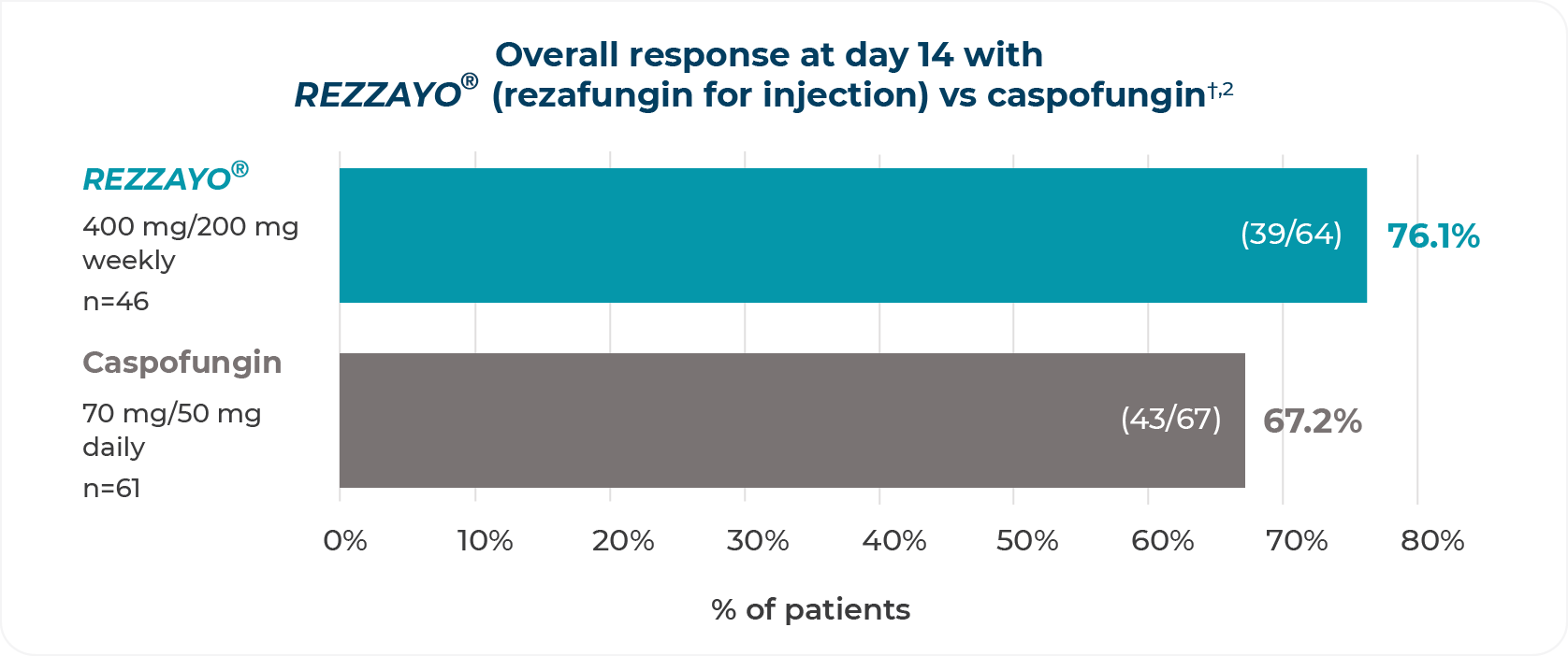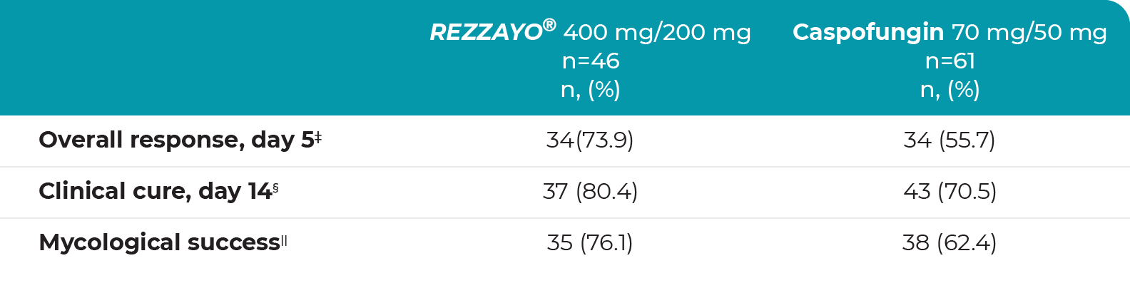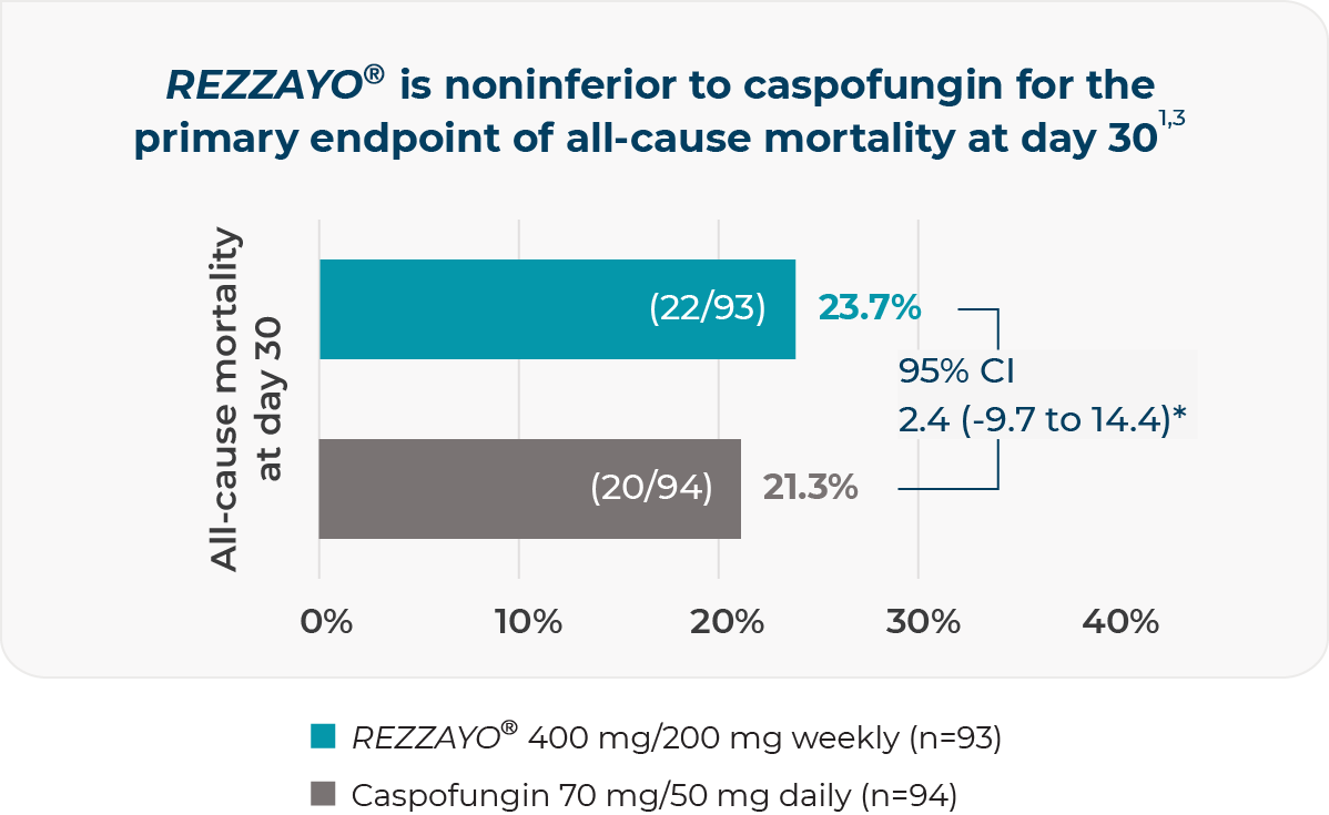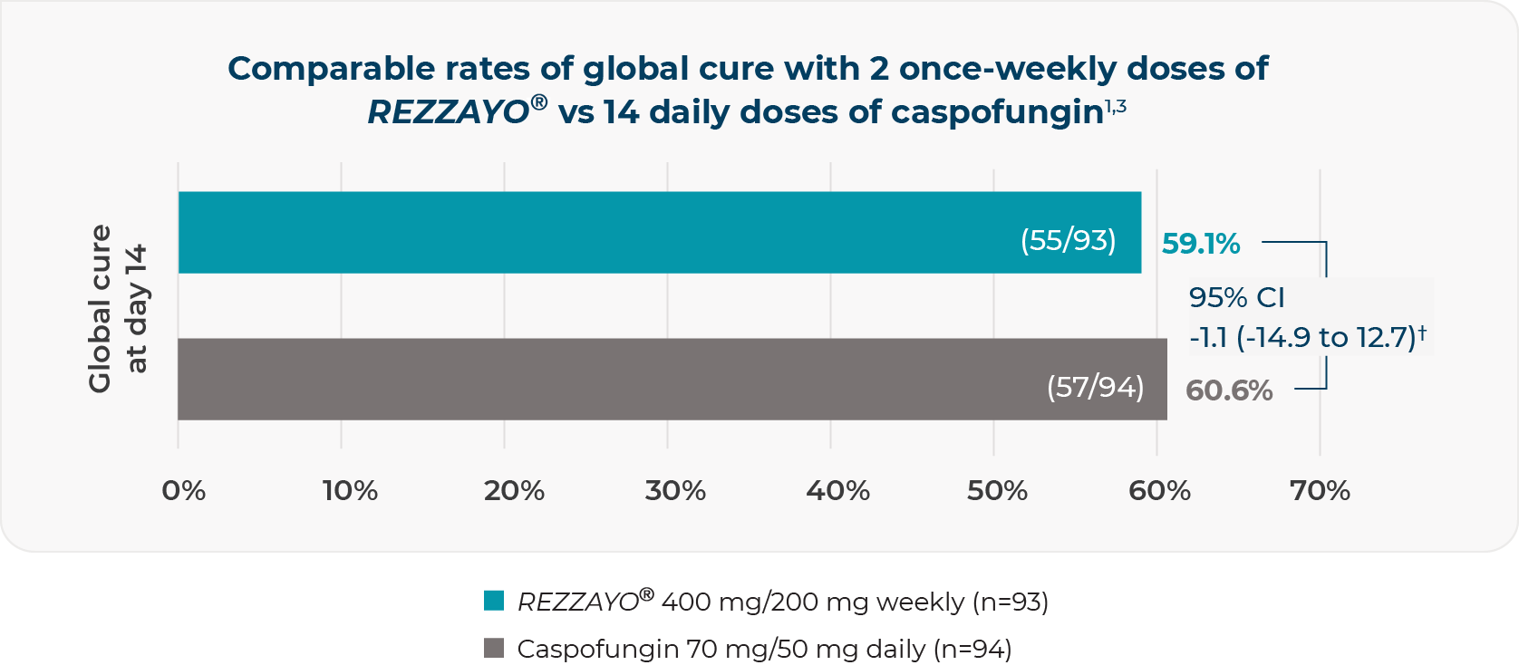Once-weekly IV infusion of REZZAYO® was noninferior to daily IV infusions of caspofungin in the modified intent-to-treat population1,3