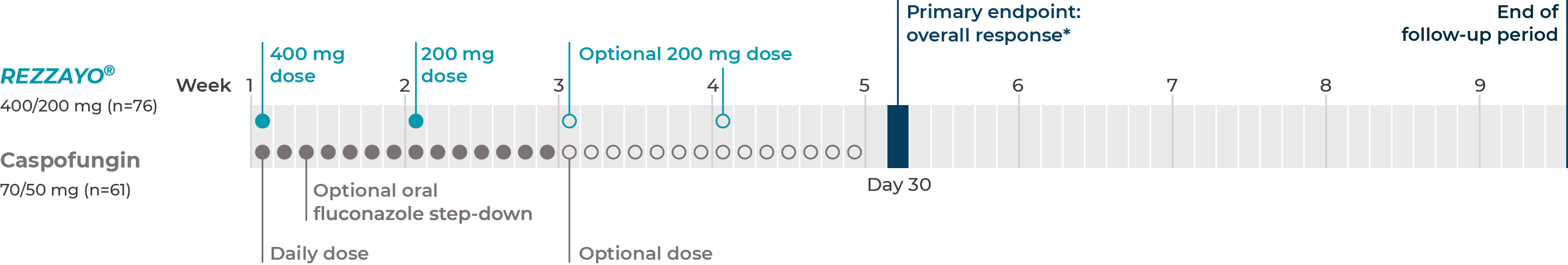 In the caspofungin group, optional oral fluconazole step-down therapy was permitted after ≥3 days of IV therapy if the patient met the criteria for cure and was preparing for discharge. Patients in the REZZAYO® group who were switched to step-down therapy continued to receive intravenous REZZAYO® once a week and daily oral placebo to maintain the masking.1,3
